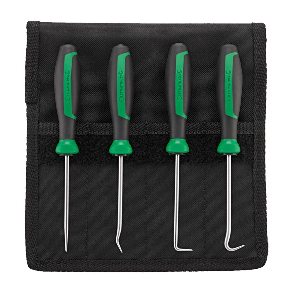 - 4-piece hook tool set for punching soft materials when assembling/disassembling small parts (such as O-rings, seals or trims).