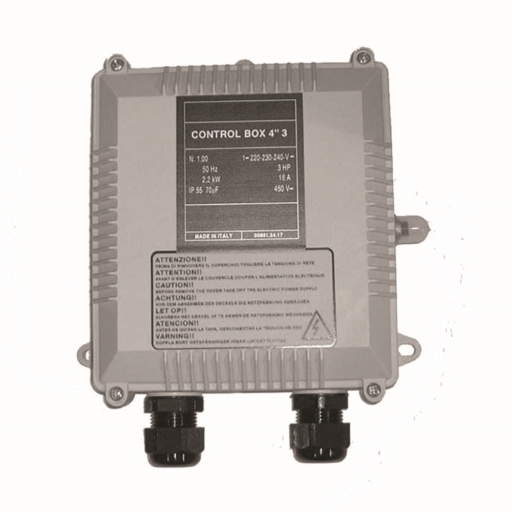 Electrical control box for operation of single-phase submersible electric pump, containing manually re-settable thermal protection, capacitor, and terminals for the connection of a pressure switch/float switch.